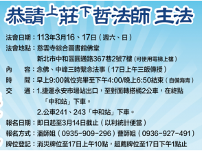 113年3月16-17日 清明節報恩祈福佛一暨三時繫念法會 與會報名:即日起至3月14日止 詳請參閱海報所載