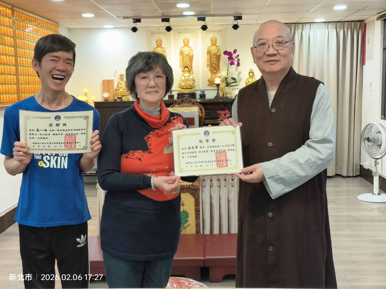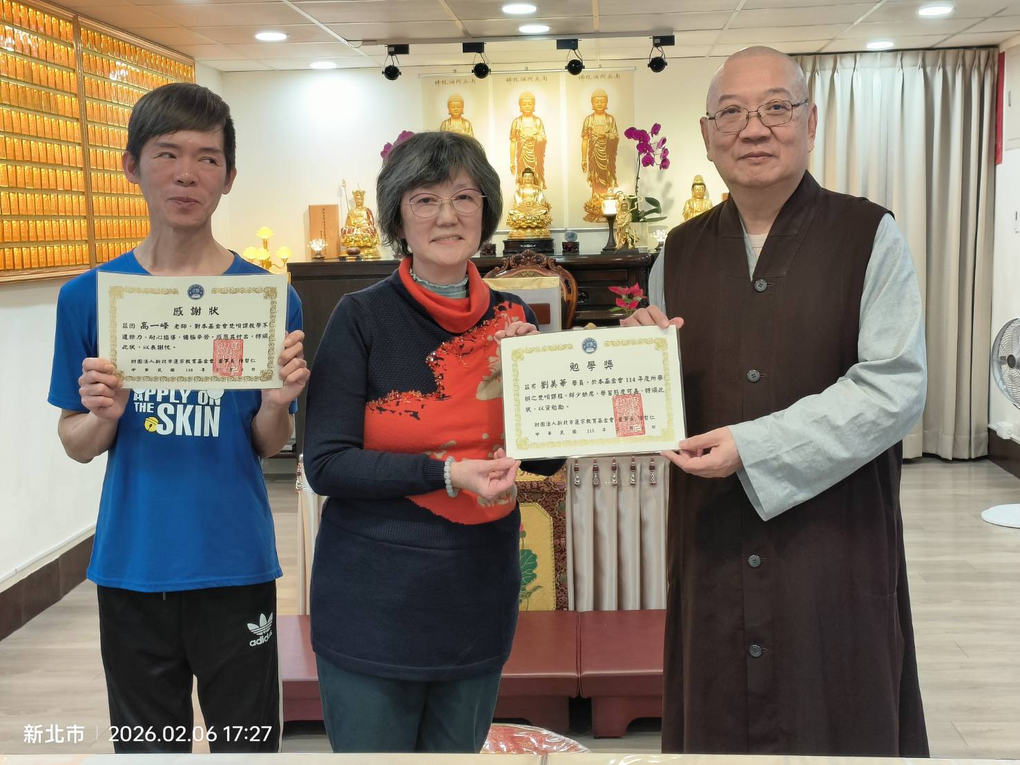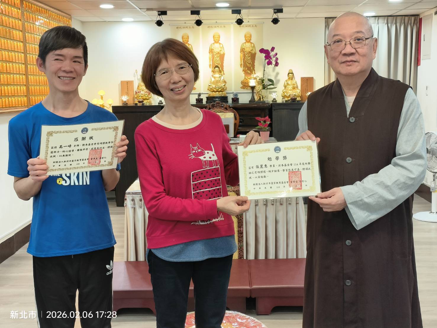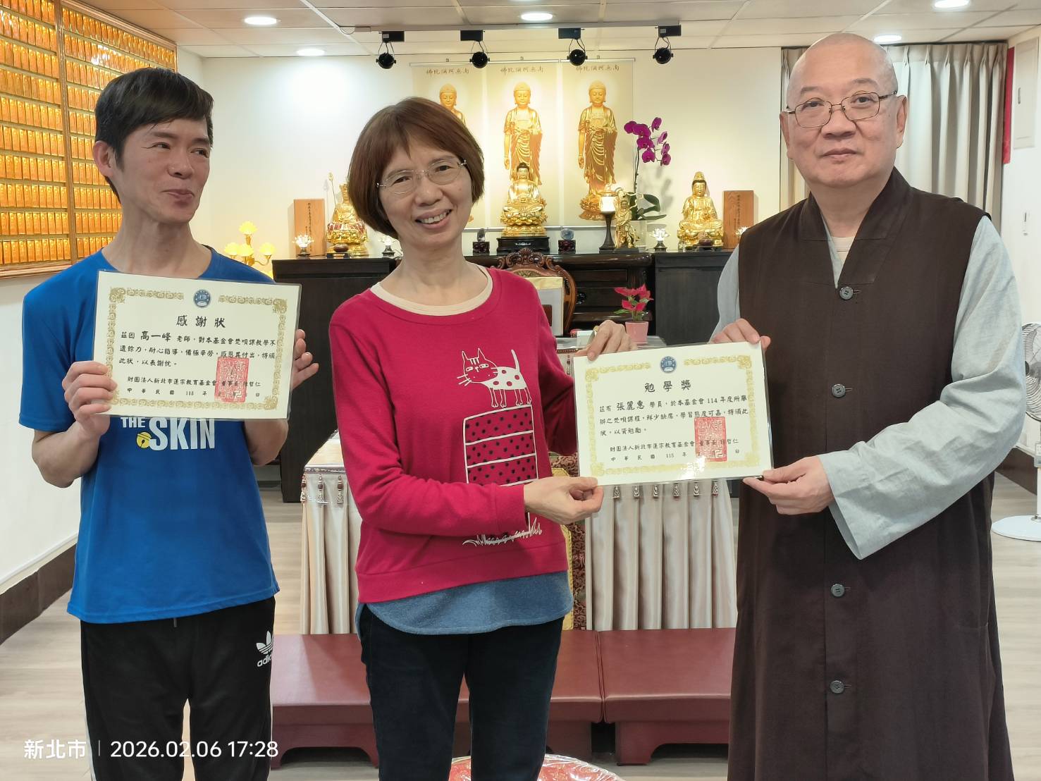 蓮宗教育基金會董事長 上莊下哲法師 謹代表蓮宗教育基金會,感謝梵唄班德惟老師一年來辛勞教導,以及鼓勵同學們的認真學習,特頒獎狀以茲鼓勵。