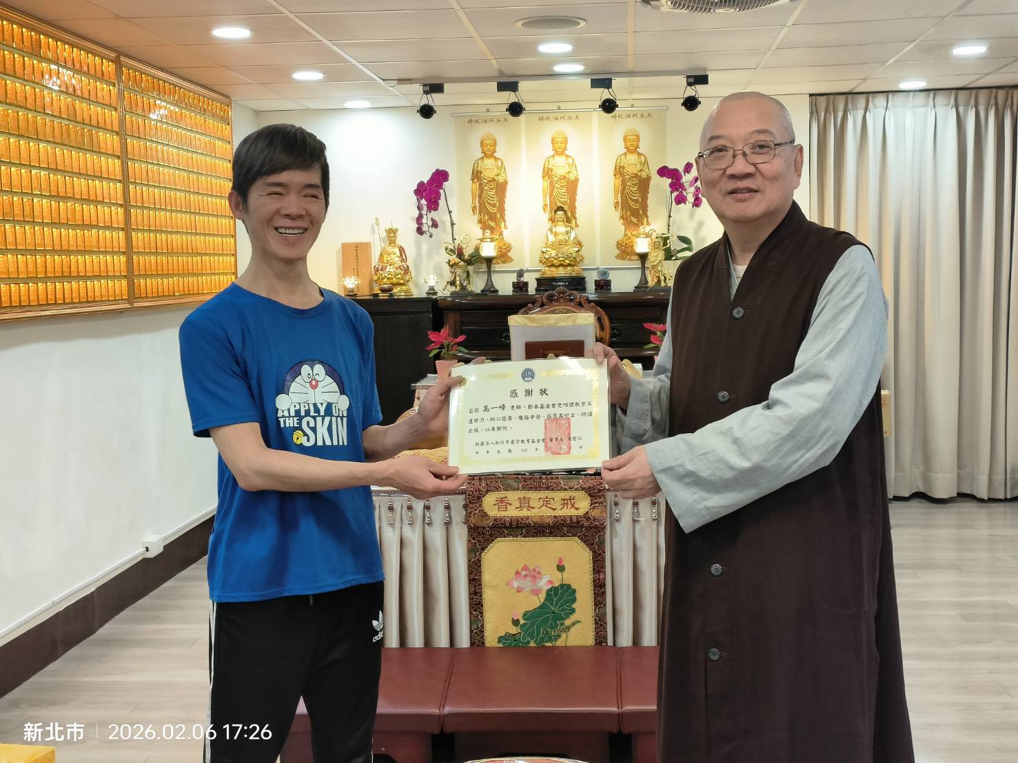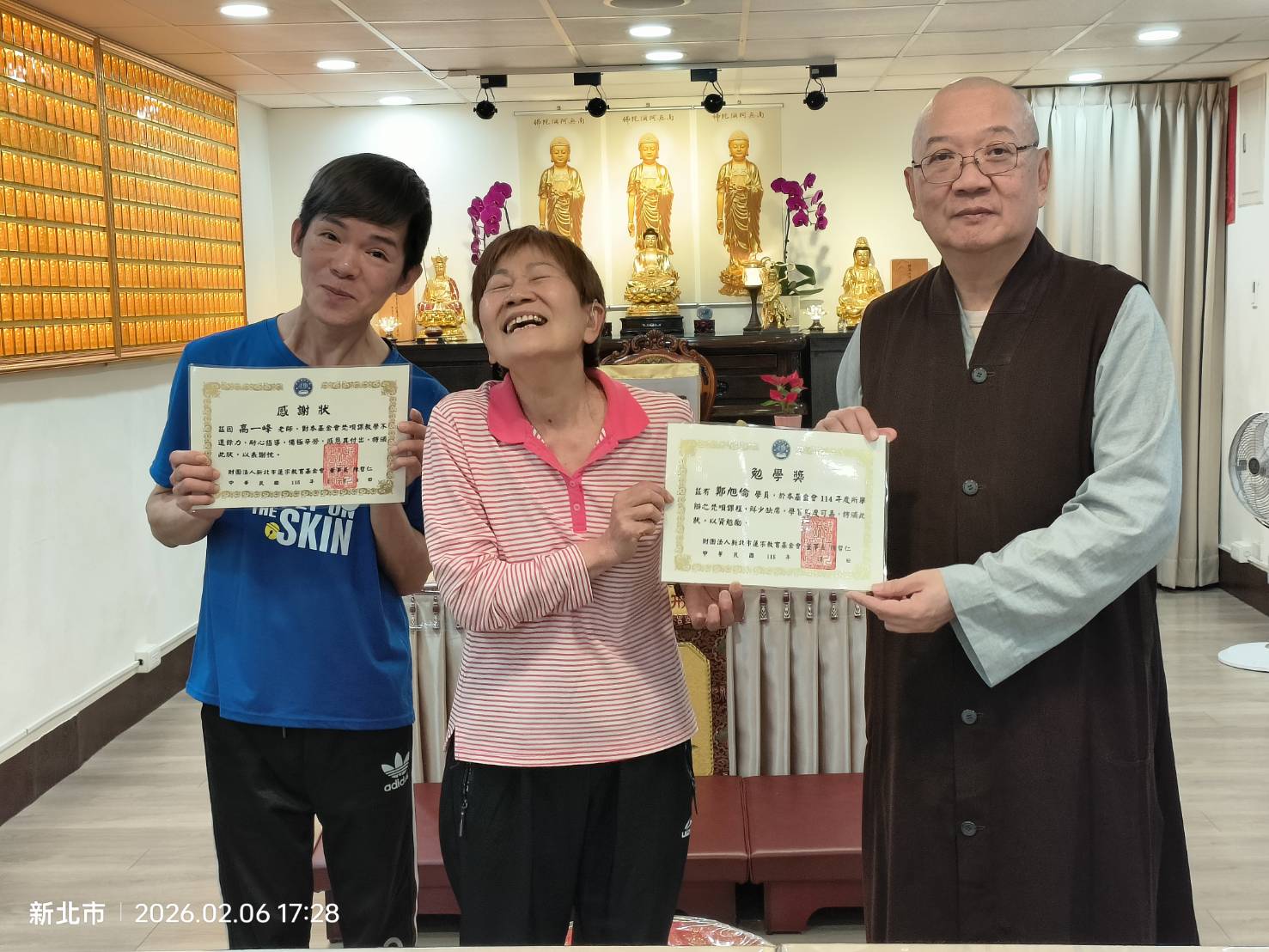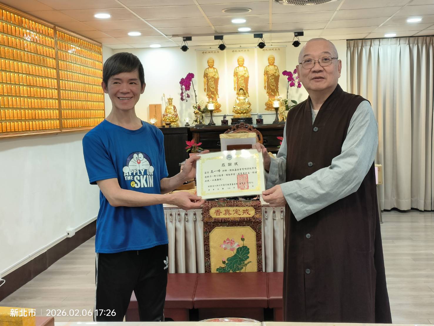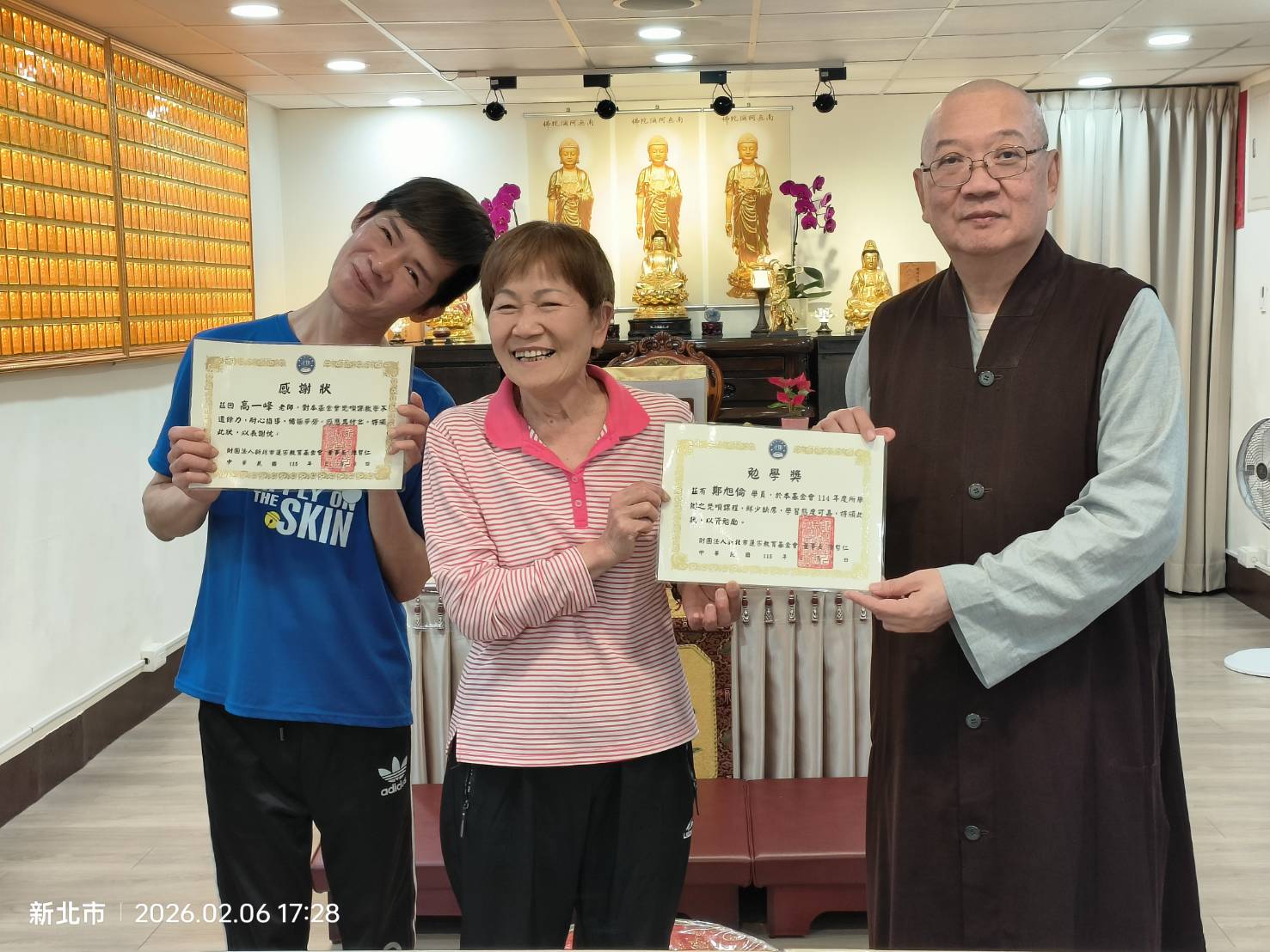 蓮宗教育基金會董事長 上莊下哲法師 謹代表蓮宗教育基金會,感謝梵唄班德惟老師一年來辛勞教導,以及鼓勵同學們的認真學習,特頒獎狀以茲鼓勵。