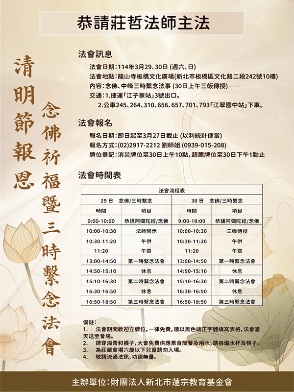 本基金會114年3月29-30日(週六、日) 於龍山寺板橋文化廣場10樓 舉辦「清明節報恩 念佛祈福暨三時繫念法會」 與會報名:即日起至3月27日止 餘詳情,請參閱海報所載 敬邀菩薩們一起與會祈福 及不吝協助本法會法訊的傳播 非常感恩 南無阿彌陀佛